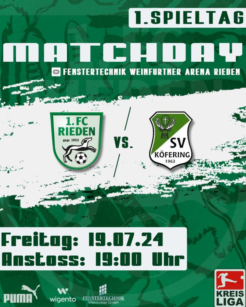 Eine Unachtsamkeit der Riedener Defensive bestrafte Dennis Kramer in der 12. Minute zum überraschenden 1:1 Ausgleichstreffer. Abermals Maximilian Nimsch erzielte nur 9 Minuten später die erneute Führung der Platzherren, die Sven Florek in der 30. Minute zum 3:1 ausbaute. Eine große Anzahl an klarsten Torgelegenheiten lies der 1.FC Rieden liegen. Im 2. Spielabschnitt dasselbe Bild. Die Heimelf erspielte sich Chance um Chance und vergab fahrlässig die höhere Führung. Bastian Härtl erhöhte in der 63. Minute auf 4:1, ein weiterer Abwehrfehler bescherte dem SV Köfering den 2:4 Anschlusstreffer zum Endstand.