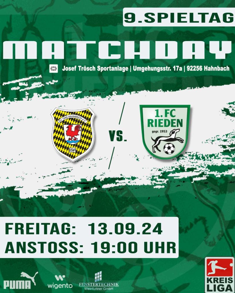 Der 1.FC Rieden ist einmal mehr an einem Freitag (Anstoß 19 Uhr) im Einsatz. Die Reise führt diesmal zu der Reserve des SV Hahnbach. Die Truppe von Christian Gäck belegt derzeit mit 6 Pluspunkten Tabellenplatz 11. Nach zwei Auftaktniederlagen gewann der SV Hahnbach II zwei Partien in Folge (3:1 – Edelsfeld, 4:2 bei der SG TuS Kastl/Utzenhofen).
