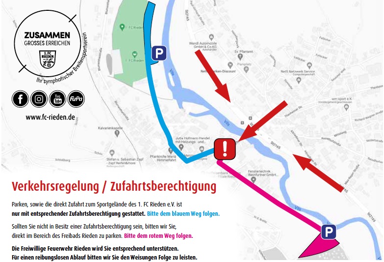 Um den Verkehr sicher zu regeln, werden wir gegebenenfalls die Verkehrsregelung mit Zufahrtsberechtigung zum Sportplatz anwenden. Bitte nutzt die ausgeschilderten Parkplätze sowie den Freibad-Parkplatz in Rieden. Bitte achtet darauf, dass die Rettungswege zum Sportplatz (Jahnstraße) frei bleiben müssen.