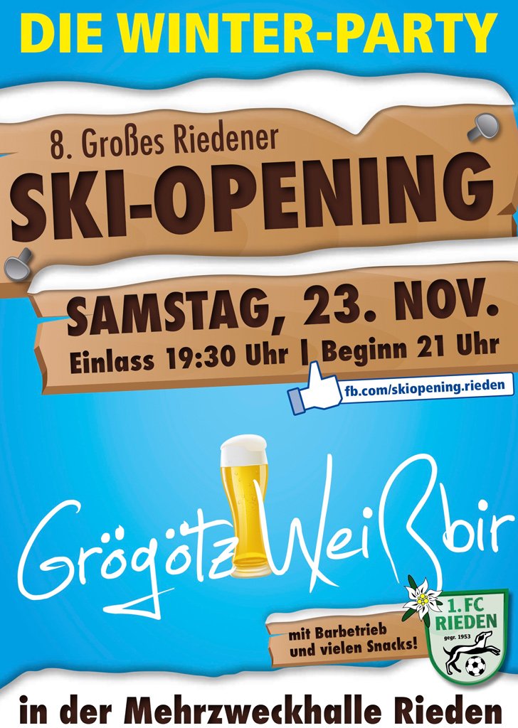 Wir schreiben das achte Kapitel Ski-Opening Rieden. Nach der ausgelassenen Feierstimmung im letzten Jahr sehen wir uns auch 2019 zu einer Neuauflage gezwungen! Und dieses Jahr rockt die Original Grögötz Weißbir Band das Skiopening in der Mehrzweckhalle Rieden.
