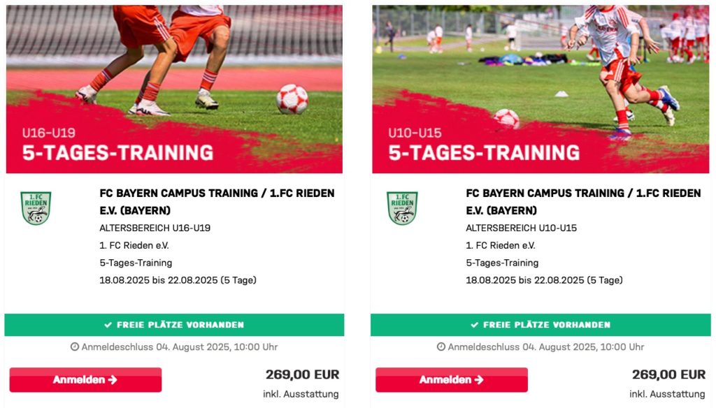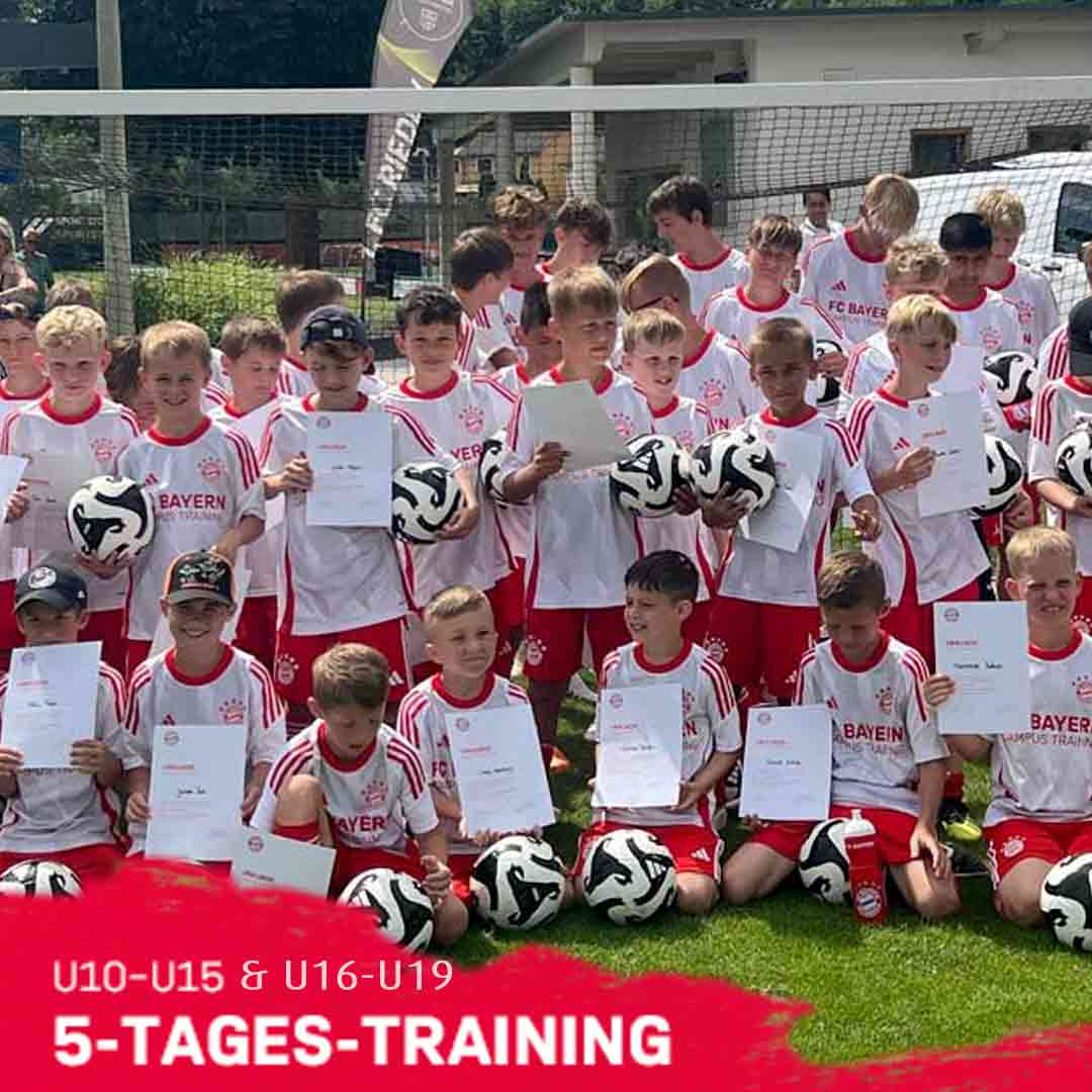 In unseren 5–Tages–Trainings ermöglichen wir es den Teilnehmern im Partnerverein des 1.FC Riedens unter professionellen FC Bayern Prinzipien zu trainieren.