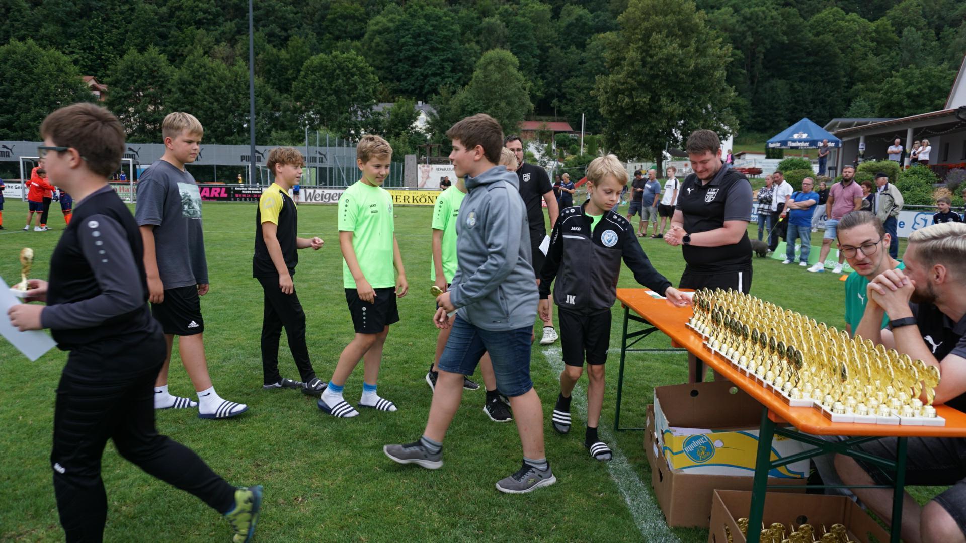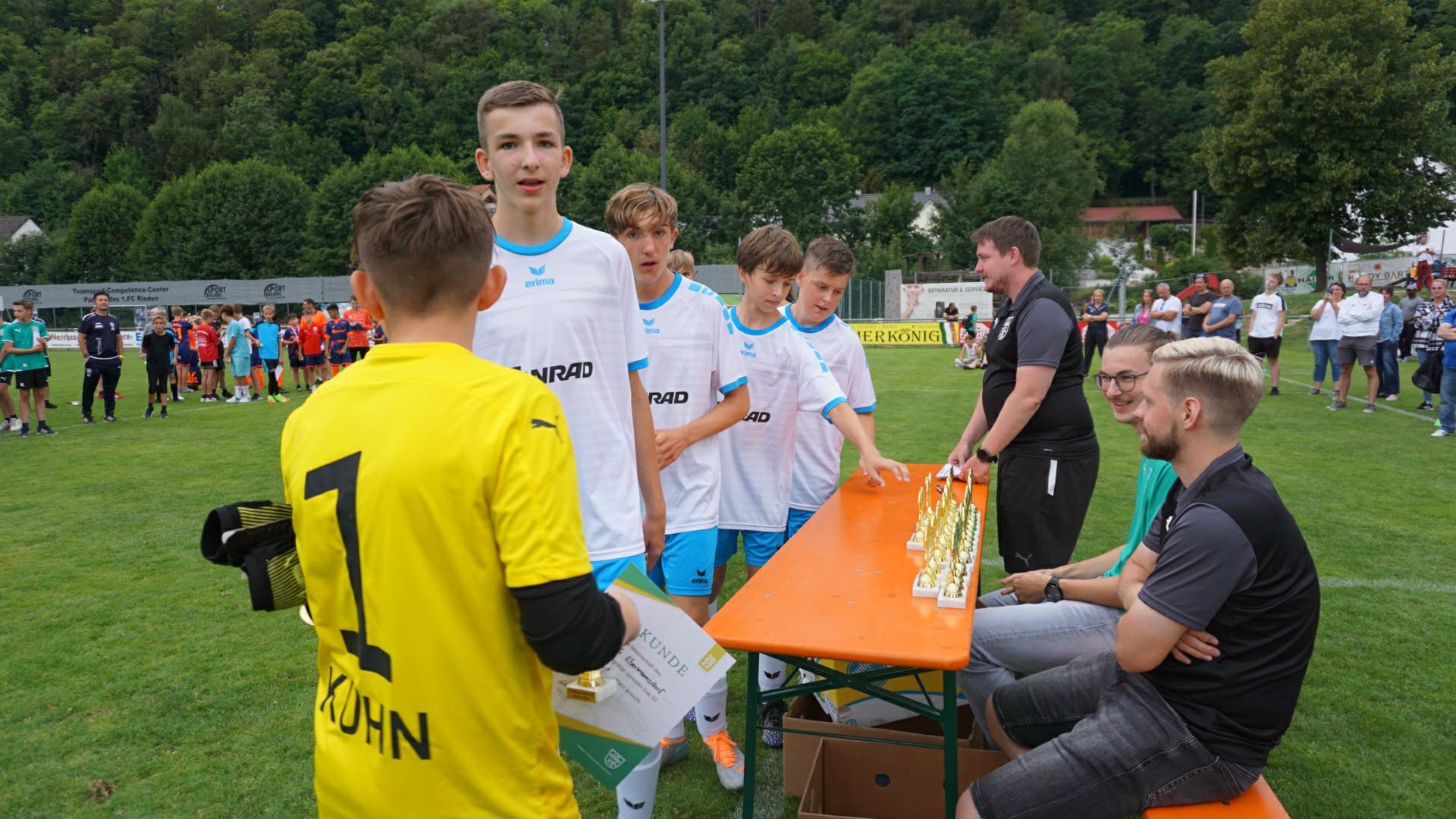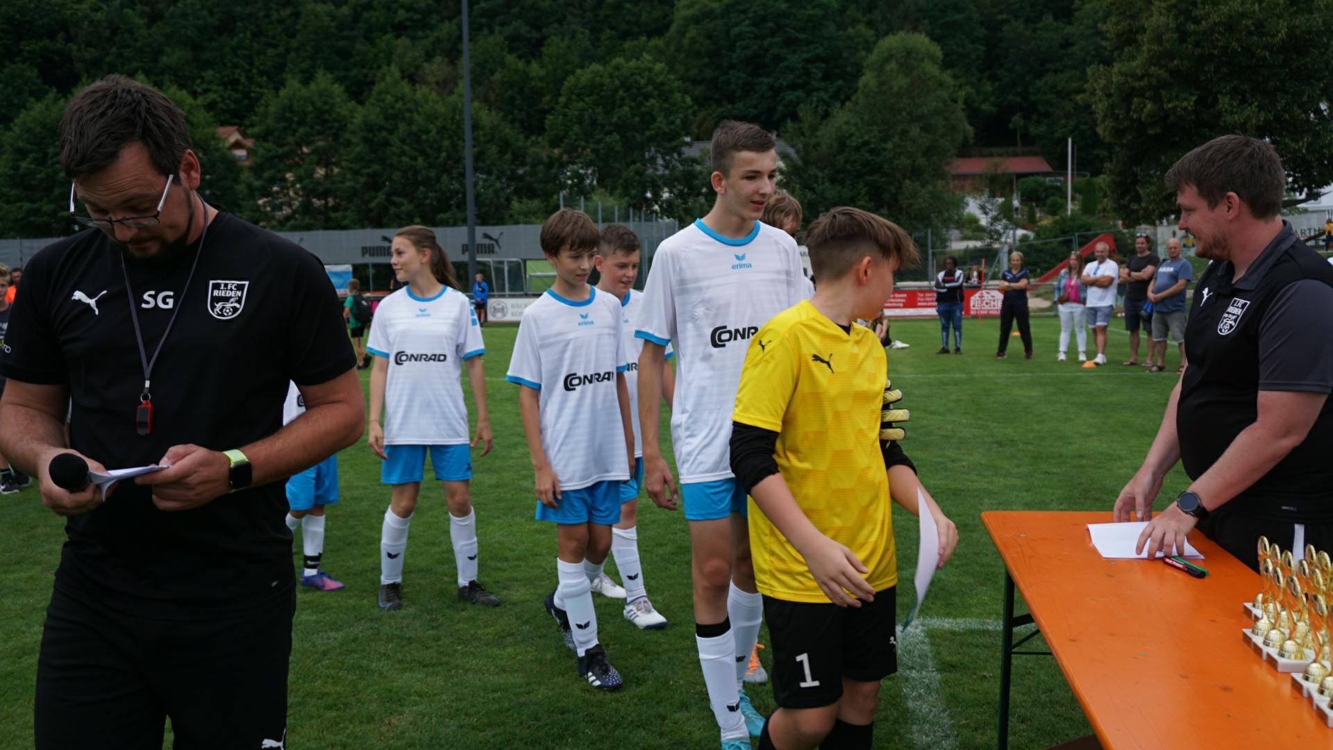 Bei der abschließenden Siegerehrung durch Steffen Genrich freuten sich alle Kinder über Pokale, Medaillen und Siegerurkunden. Ein besonderer Dank des 1.FC Rieden geht an alle unterstützenden Helfer/innen und den vielen freiwilligen Schiedsrichtern, die teilweise von den Jugendtrainern und Jugendspieler unter der Anleitung von Gerhard Söllner gestellt wurden. Freitag und Samstag waren BFV Schiedsrichter am Start die vom Fischer Moritz eingeteilt wurden und Thomas Ehrnsperger (Regionalliga Schiri,1.FC Rieden) ließ es sich auch nicht nehmen für seinen Heimatverein zu pfeifen. Schwendner Lukas unterstütze als dritter im Bunde. Die neuen BFV Regel fanden nicht bei jedem Zuschauer Zustimmung aber das Schiedsrichter Gespann meistere dies souverän und ließ die ein oder andere Spitze einfach links liegen